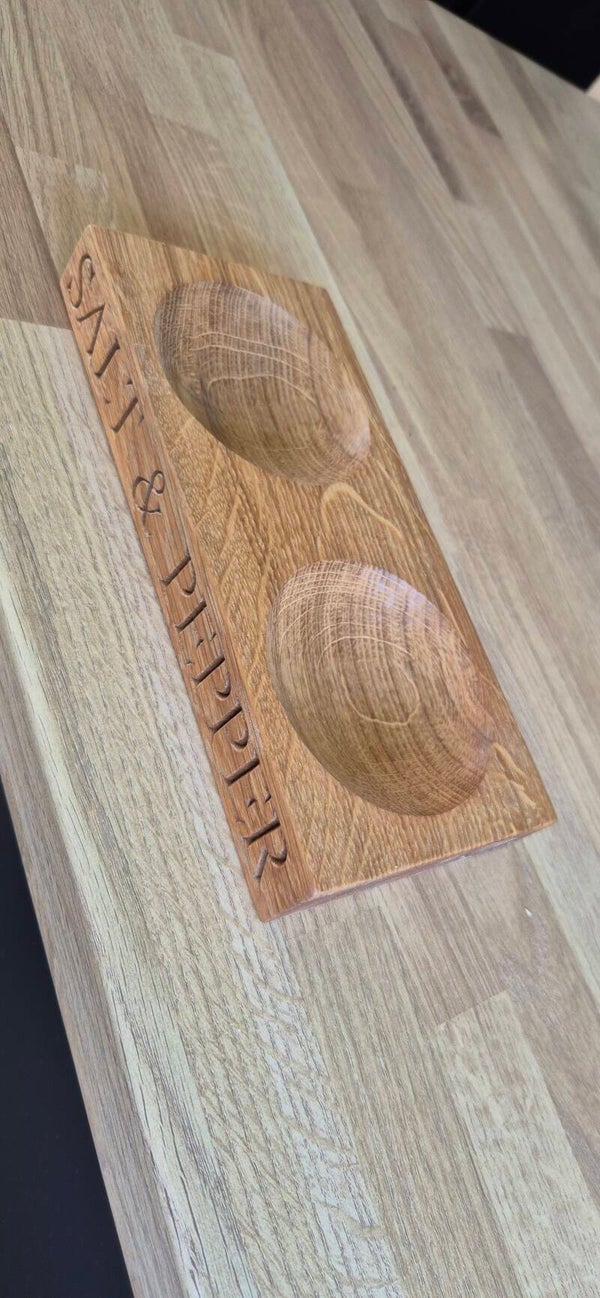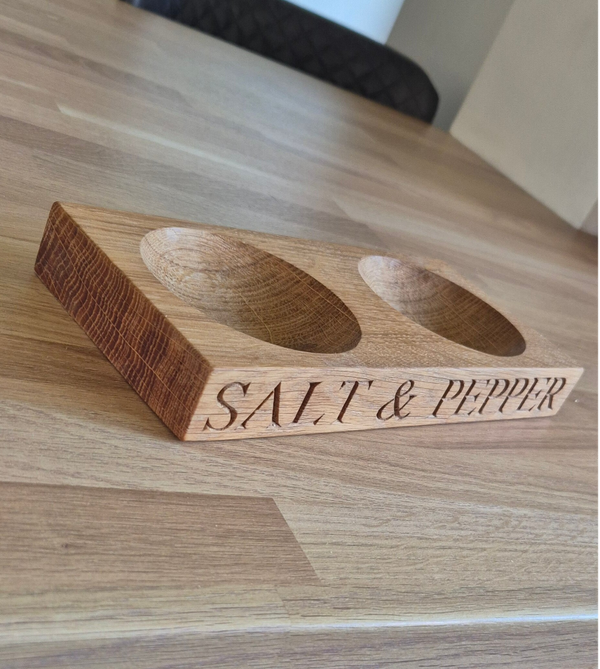 These beautiful 'Salt and pepper' pots, are hand engraved, even the pots have been scooped out by unique shaped carving chisels, as you will be able to feel, now that's traditional woodworking!