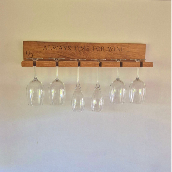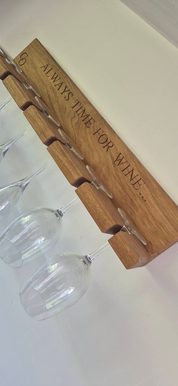 The innovative design attaches to your wall, held in place by two strong brackets. With space for six gless, you can display your favourite ones with ease. We can also make the glass rack in bespoke sizes to meet your requirements, also you can add your own engraving and possibly a carving if you would desire it!