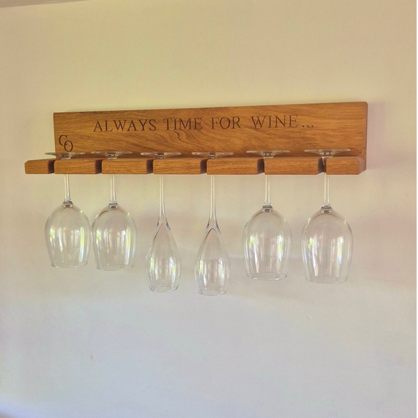 Here we have our classy and sophisticated, personalised wine glass rack. This was designed to store your glasses simply and securely, and looks great while doing it. Handcrafted and engraved from solid oak in my workshop in North Yorkshire, this wine rack is built to last.