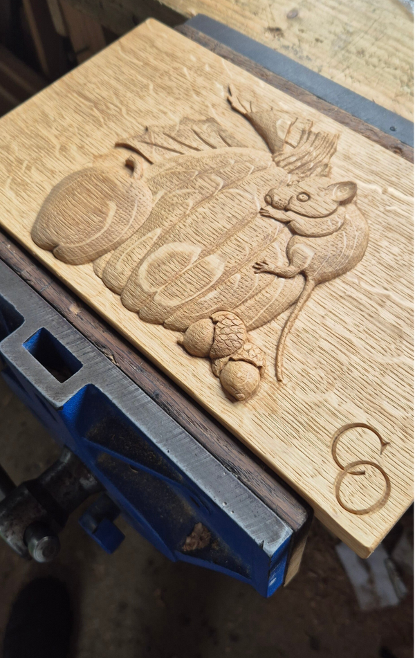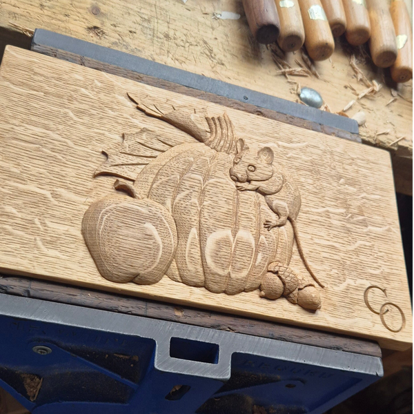 The Field Mouse, a carving designed and hand carved in my workshop in North Yorkshire. This design came from a picture i saw in a childrens book. I added the addition of some fallen acorns to celebrate the stunning oak i carve from. Hand carved and fitted with a backplate, this piece of wall art really captures a small moment in nature.